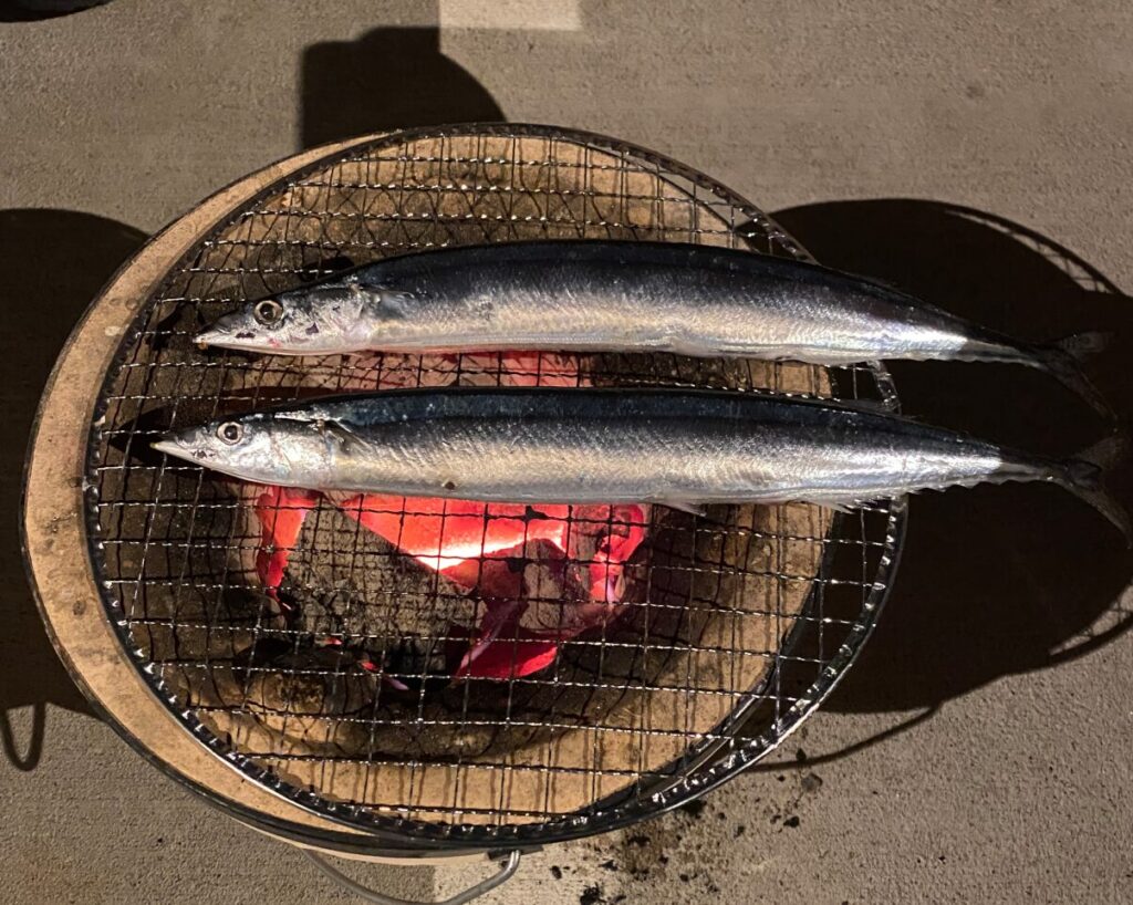 日が傾いて涼しい風が吹く中、炭の赤い火を眺めながら焼きあがったさんまを口に運ぶ。